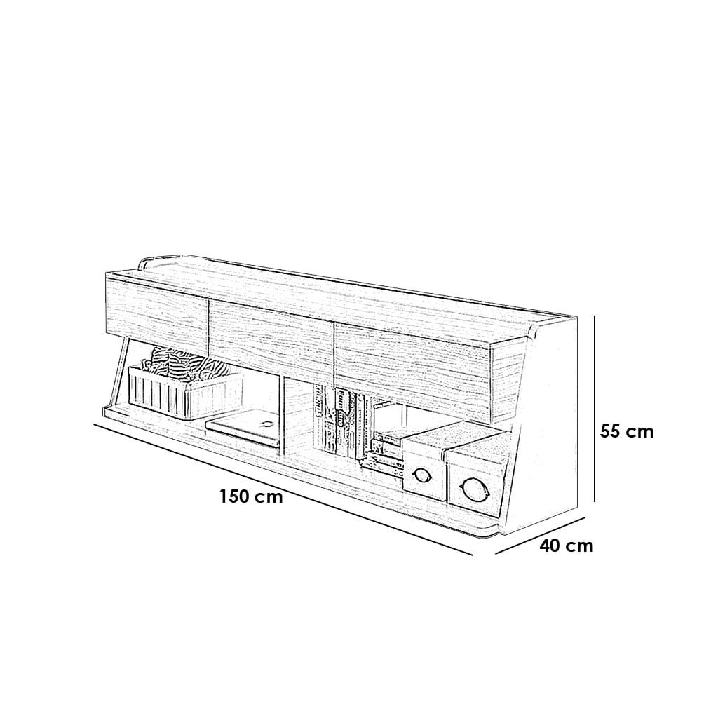 الوحدة مزودة بـ 3 أدراج علوية مغلقة لتخزين الريموتات والمتعلقات الصغيرة، بالإضافة إلى أرفف سفلية مفتوحة مناسبة للكتب، أجهزة الألعاب، اللاب توب أو الديكورات.