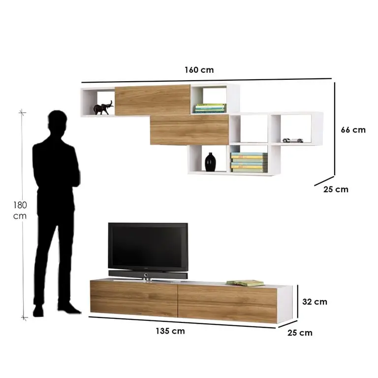 وحدة تلفزيون حائط أرفف و أدراج 2 قطعة | ام دي اف ملامين| أبيض و بني | 135×32×25سم