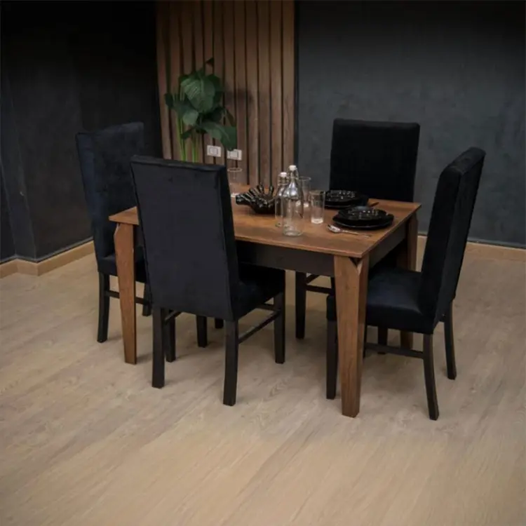 لمة العيلة محتاجة شياكة! طقم سفرة 5 قطع (ترابيزة + 4 كراسي) بتصميم عصري يجمع بين متانة خشب الزان وفخامة قماش القطيفة، مخصص للمساحات الذكية والبيوت اللي بتدور على الرقي.