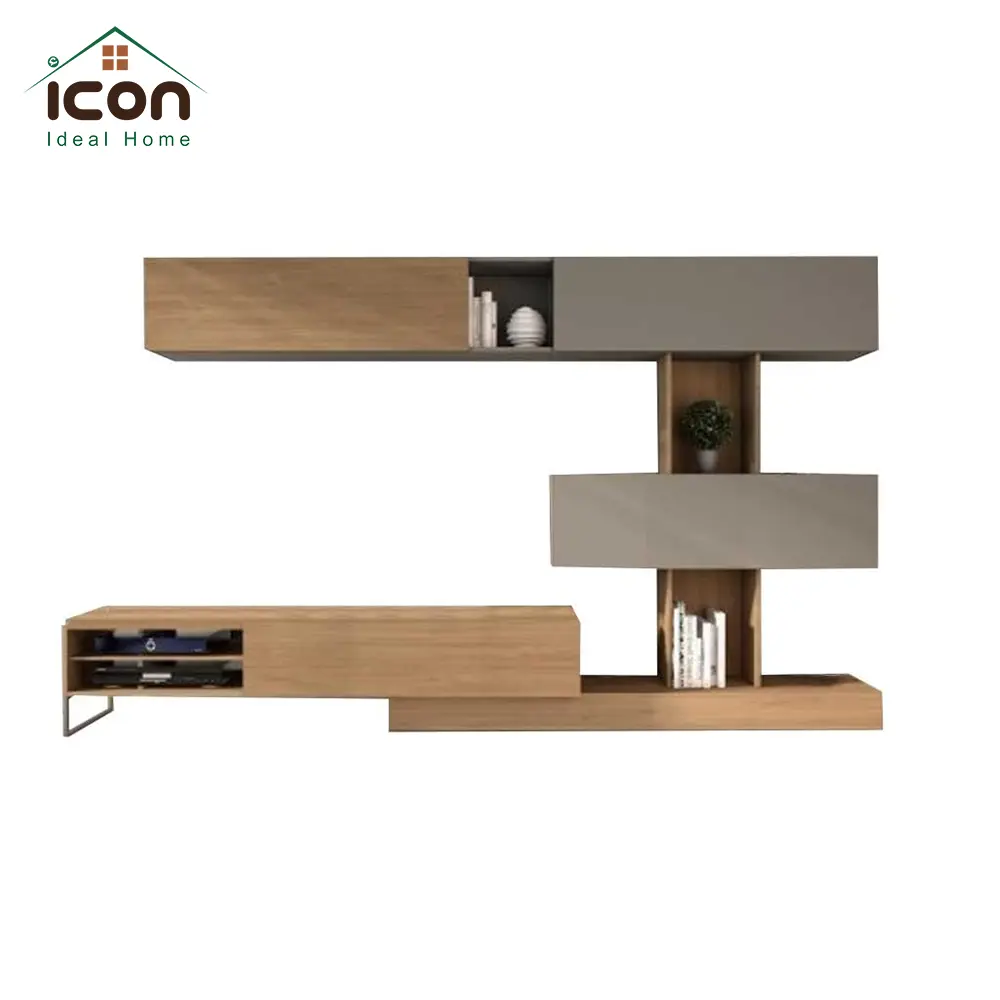 التصميم بيعتمد على دمج اللون الخشبي الدافئ مع الرمادي العصري، وده بيدي شكل فخم ومريح في نفس الوقت. المكتبة بتتكون من وحدة أرضية للتلفزيون مع وحدات تخزين علوية جانبية، وده بيوفر مساحة استغلال ذكية للحائط بالكامل.